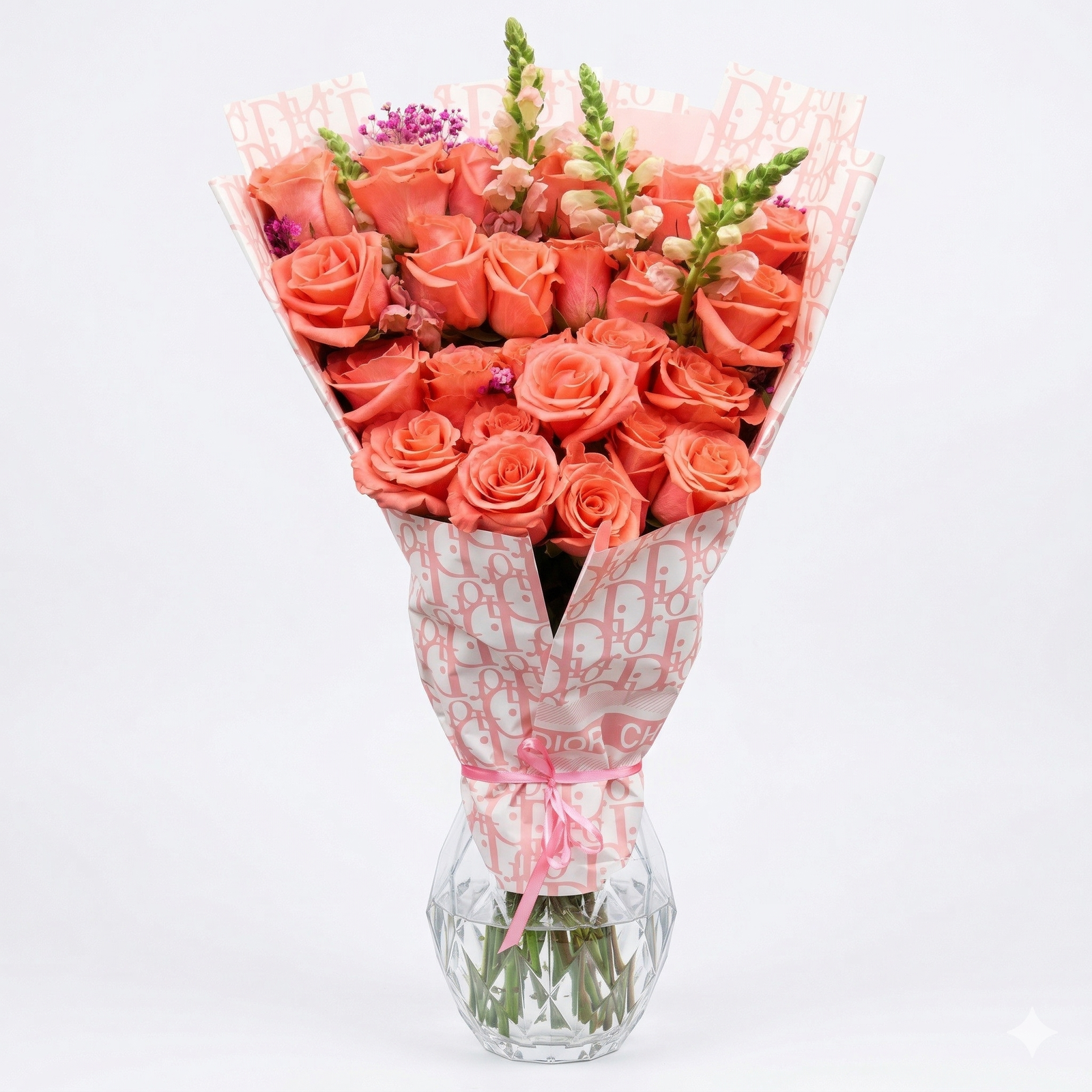 A stunning Buchón-style bouquet of premium coral roses accented with white snapdragons and purple fillers. Presented in a luxury pink-and-white patterned designer wrap and finished with a satin bow. A bright, high-volume floral statement that exudes joy and elegance.