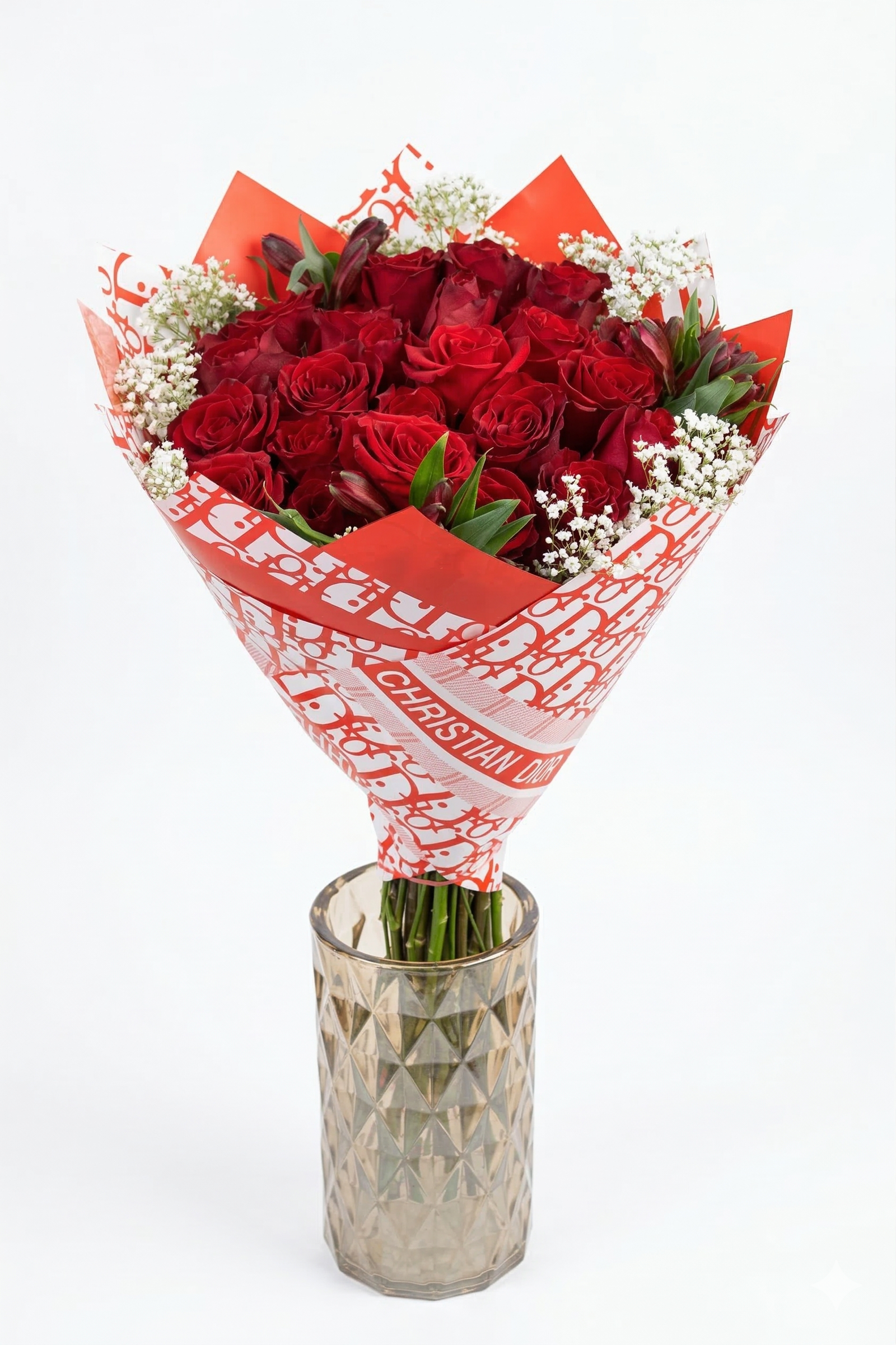 A stunning Buchón-style bouquet featuring 24+ premium red roses and white baby’s breath. Beautifully presented in a designer red and white wrap. A luxurious and classic choice for your most special moments.