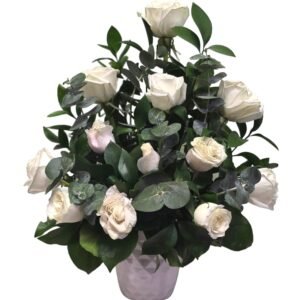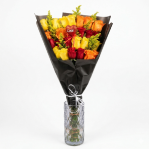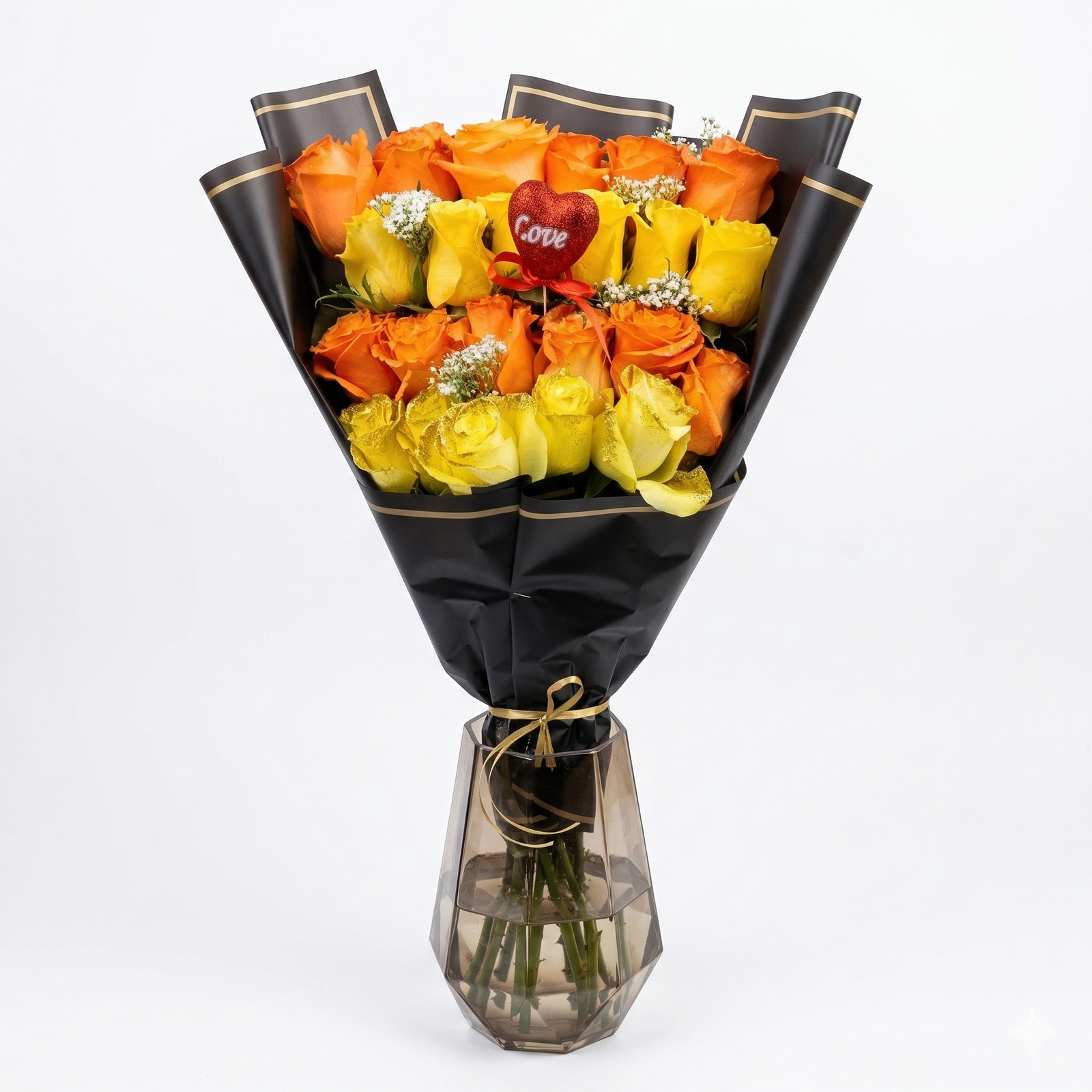 A stunning Buchón-style bouquet featuring orange and yellow roses with a unique gold glitter finish on the accent layer. Beautifully presented in a sleek black and gold designer wrap with a signature ‘Love’ heart pick. A bold, high-density floral statement that radiates energy and luxury.